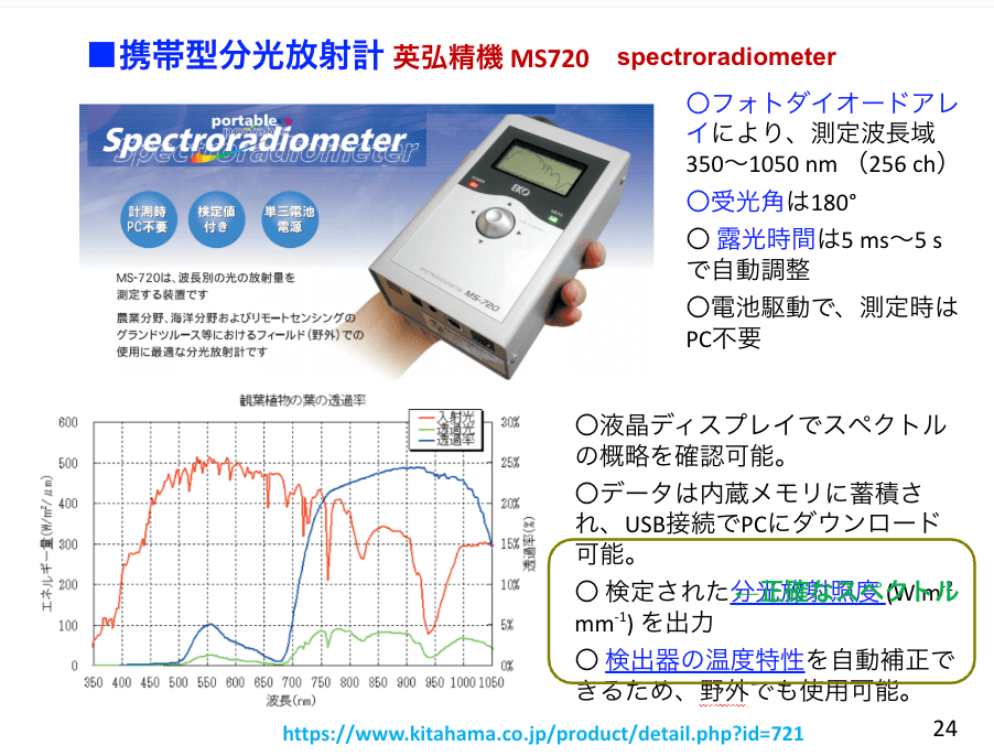 携帯型分光放射計を使って反射率の測定を行っていますが、これはフォトダイオードアレイを使っており、可視光を含む被害サンゴ0から赤外線57メーターまで256チャンネルで観測ができます。
