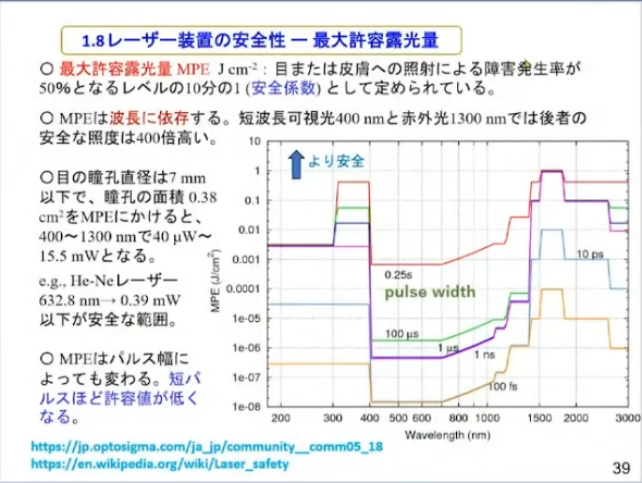 目に安全なレーザーの最大許容露光量(MPE) が決まっていまして、障害発生率が50%となるレベルの10分の1となるレベルが安全ケースではかかっています。