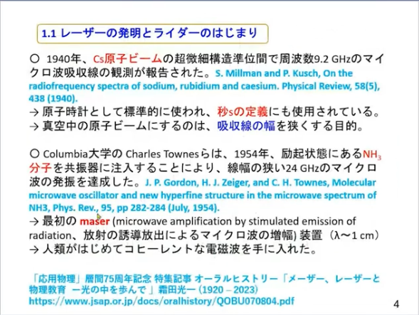 他のセミナーでもお話があったかと思いますが、この世界の始まりは実は原子ビームであるとか、あるいはアンモニア分子、アンモニア分子の共振器であるとか、その辺りがスタートなんです。
