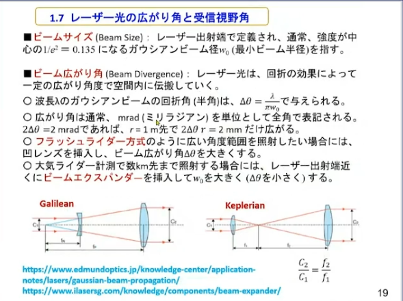 レーザー光の広がり、角と受信視野角のところでは、どのLIDARでも同じように光学装置としての性質がありますので、そこで必要となる考え方について触れておきたいと思います。