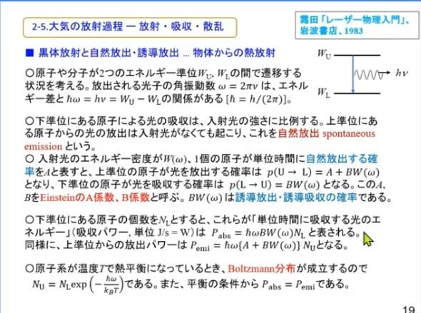 黒体放射は放射です。それから自然放出で誘導放出という概念があり、この自然放出と誘導放出が物体からの熱放射を記述しているということになります。