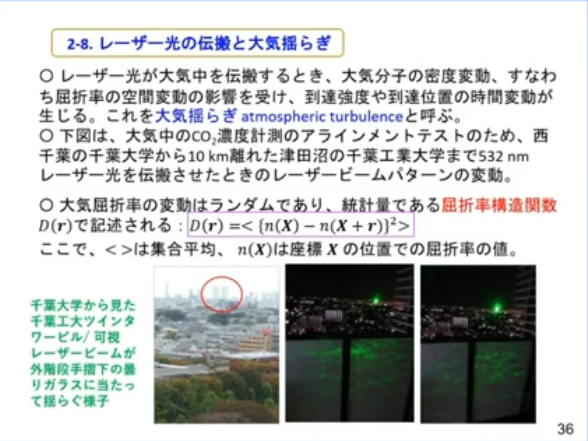 大気中を太陽光やレーザー光が通るわけですが、散乱と吸収、したがってそのまま消散することによって、その強度は次第に減衰をするということになります。