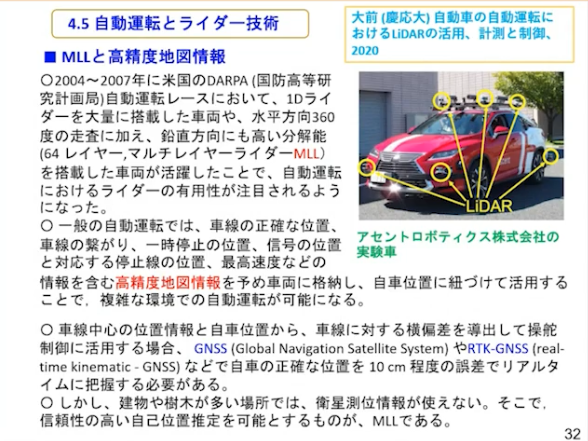 自動運転車両にの道路走行実験例を紹介したいと思います。日本の学会誌で紹介されたもので、名古屋大の赤井さんらによる自動運転におけるライダーの活用です。反射強度は利用しないで、3D点群だけを使ってるということですね。