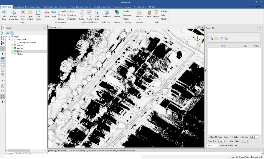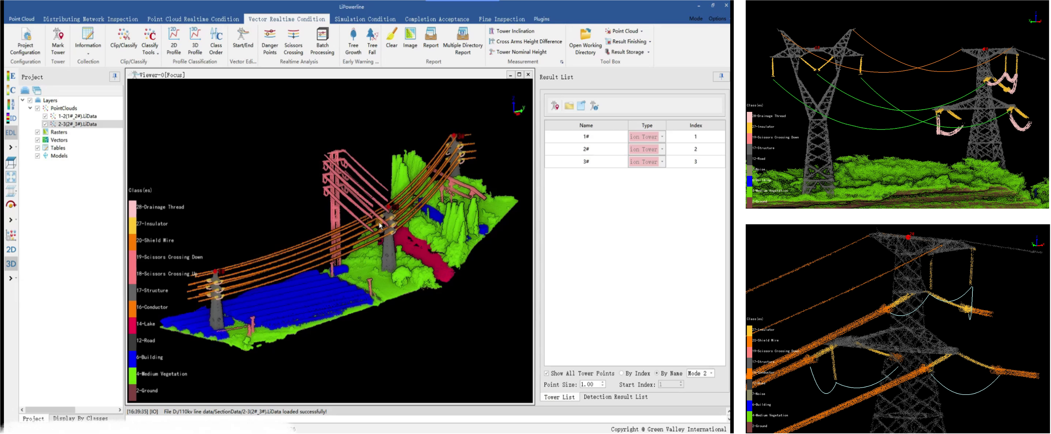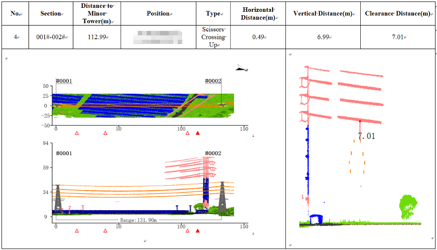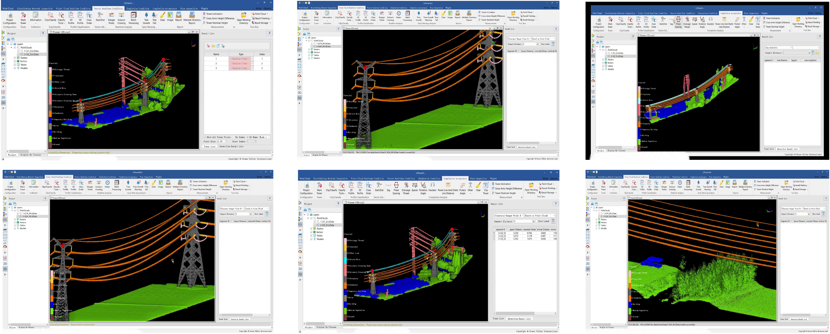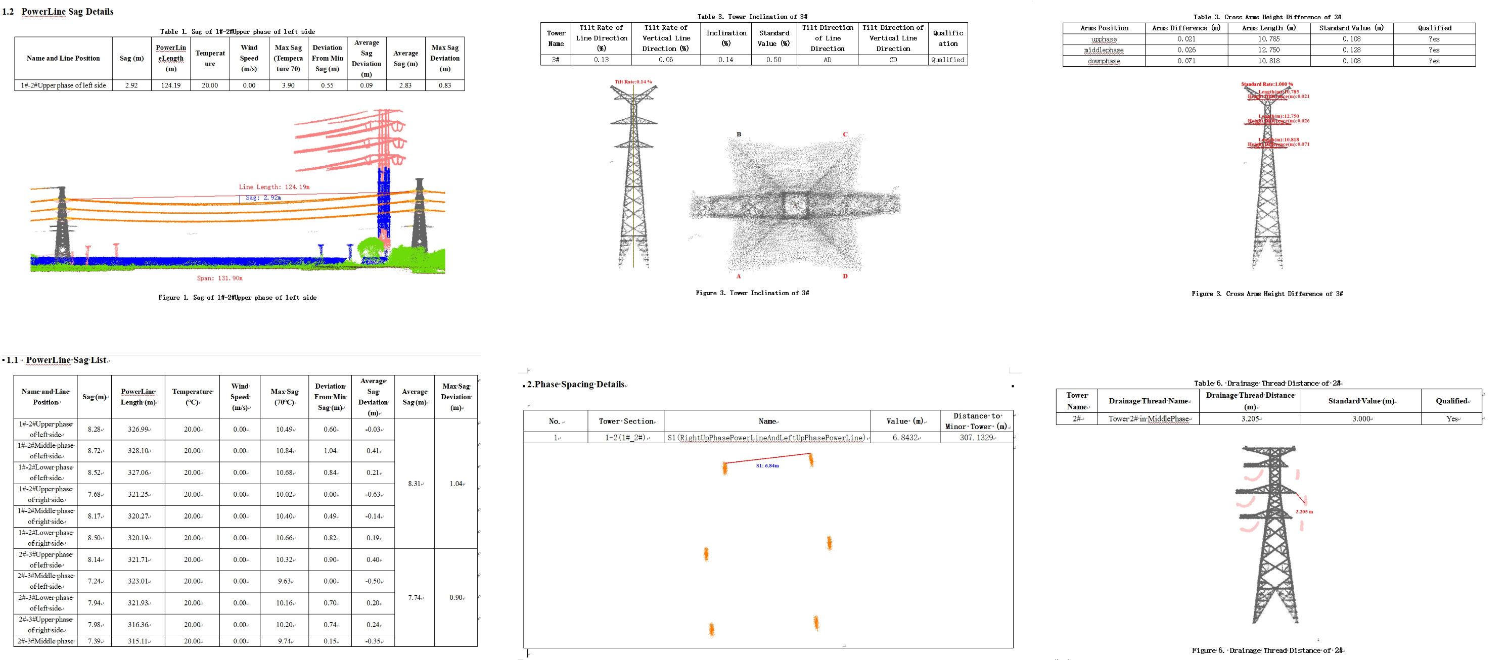 最小距離測定、位相距離解析、たわみ解析、鉄塔傾斜解析、腕木高差解析など、電力線と鉄塔の 15 種類以上の測定および自動解析機能を提供します。インフラ受入れのための標準測定レポートを出力します。