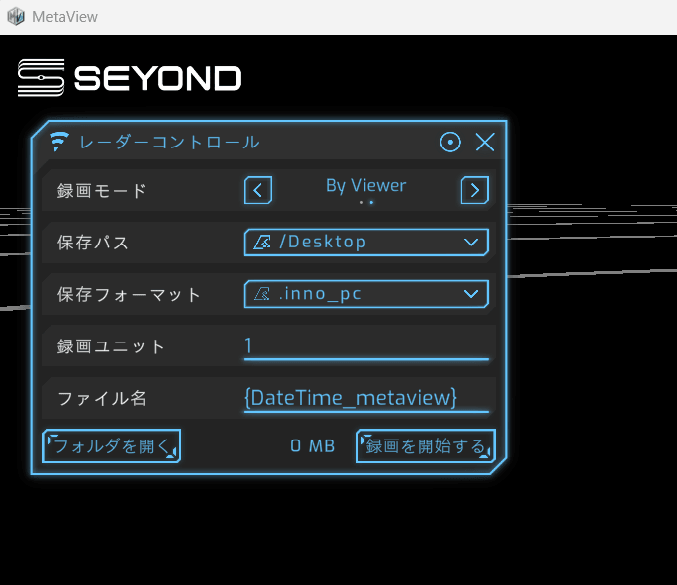Seyond製 Metaview(メタビュー)とは、Seyond製LiDAR(例:Falcon K2、Robinシリーズ)から出力される点群データを、PC上でリアルタイム表示(Live)・録画(Record)・ローカル再生(Replay)できる公式ビューアです。
