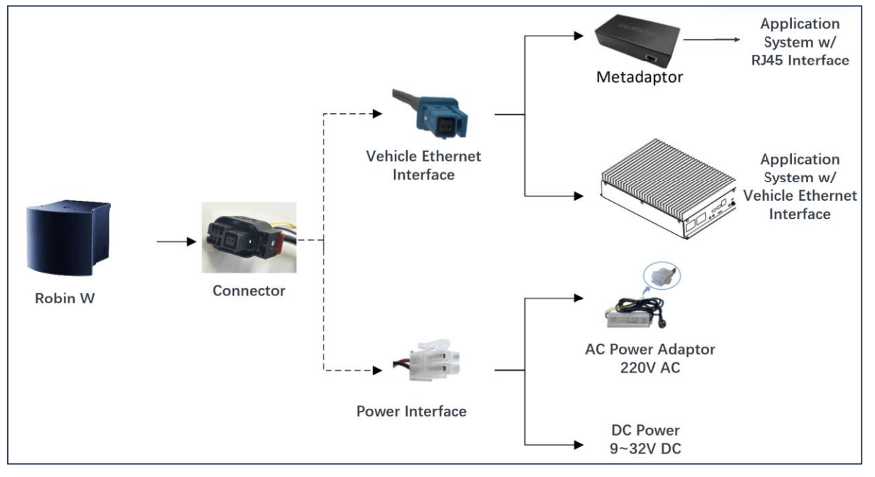 MetaViweを起動する前に、LiDARを起動しておきます。下記はRobin Wの接続例ですが、FalconK2,Robin E1Xも同じです。基本的には付属ケーブルを使って、本体にMetAdaptorを介して、電源とPC(LAN)に接続します。