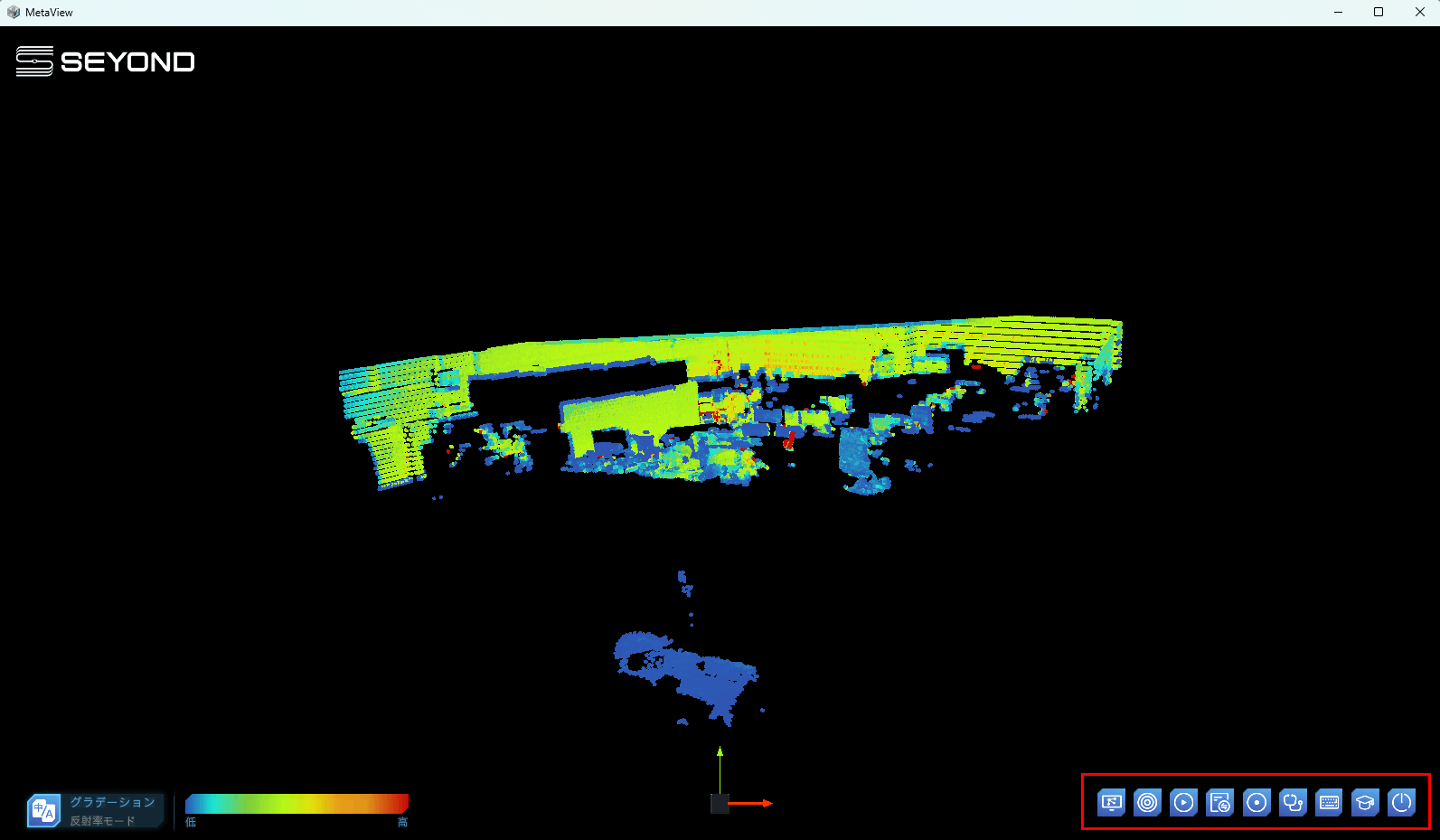 IPの設定に問題がなければ、MetaViwerを起動すると同時に画面に点群が表示されます。各Viwerの操作は、右下のアイコンから行うことができます。