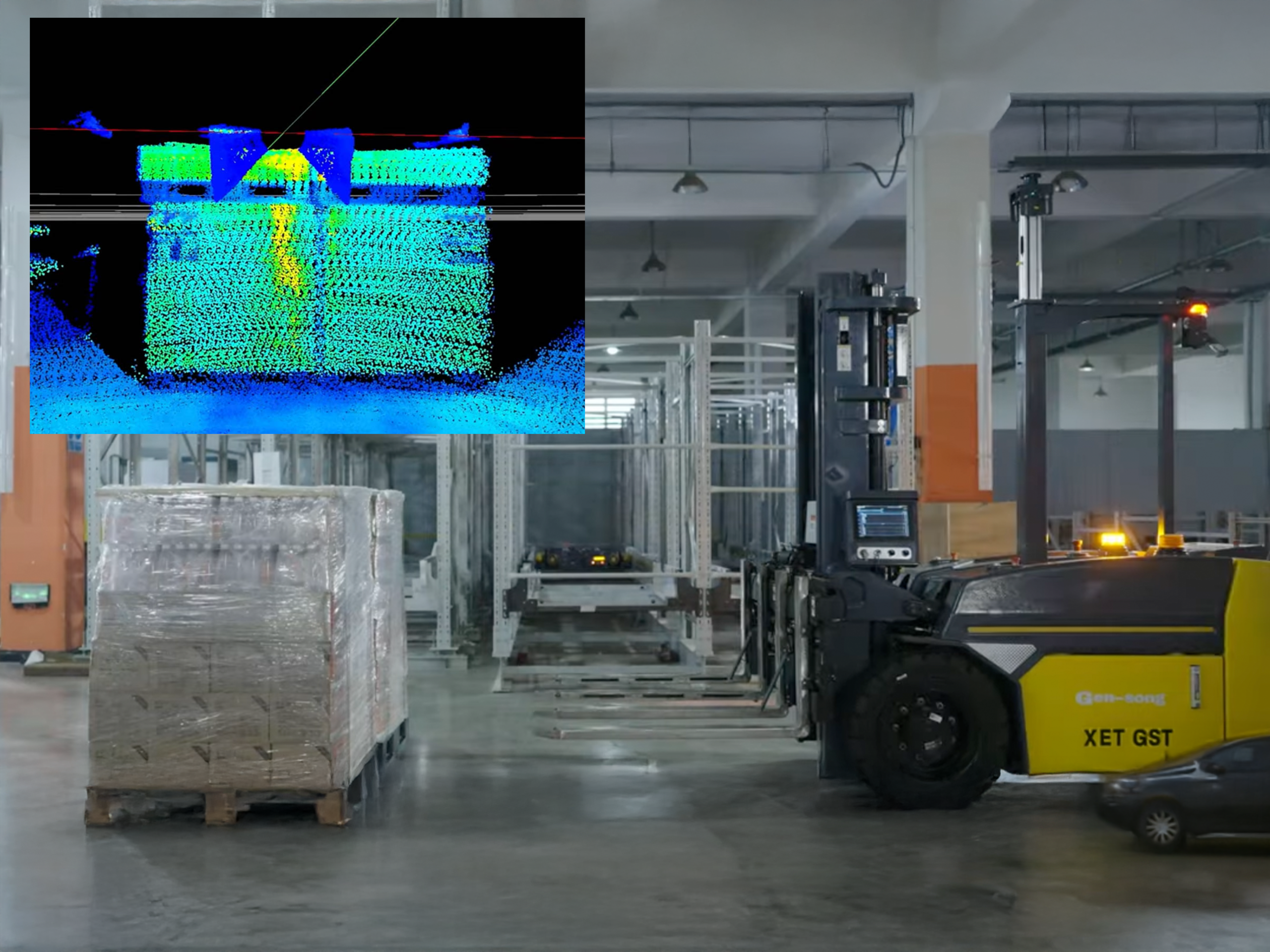 フォークリフトの自動操縦と荷物の検知に使われます。