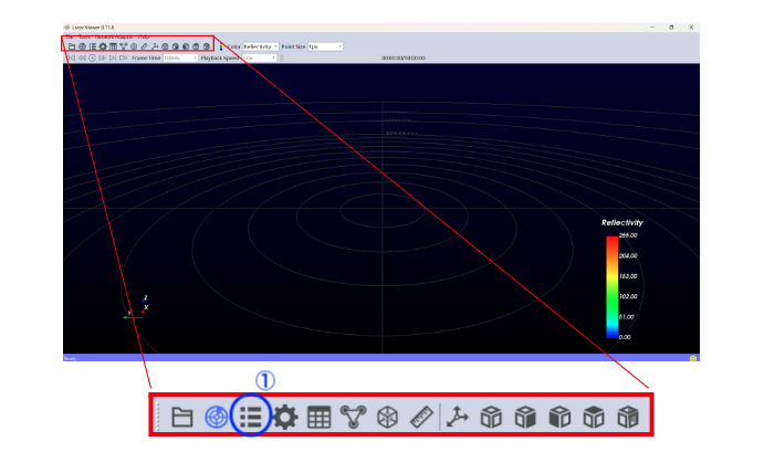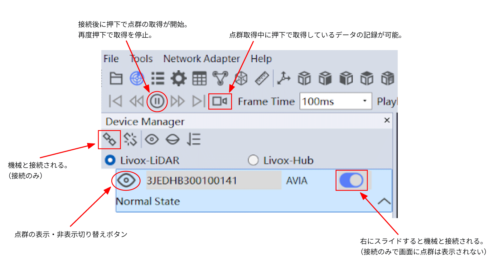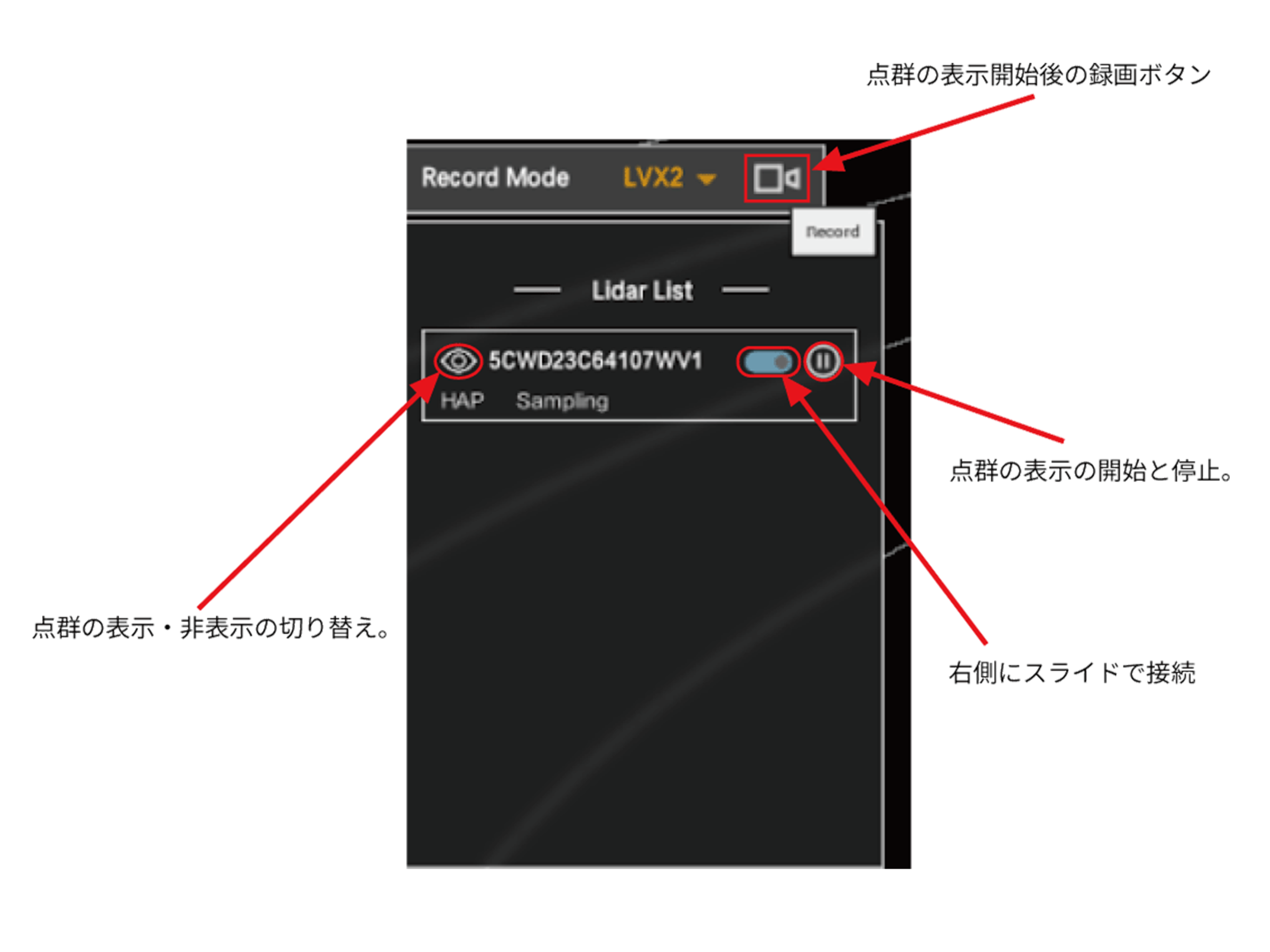 - LiDAR List にあるボタンを使って接続と点群の表示ができます。