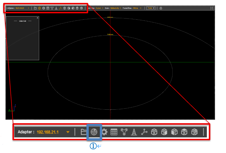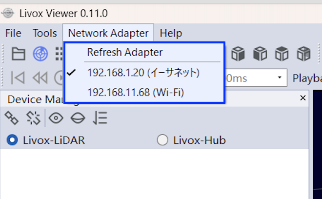 「192.168.1.xx」3項目目までは同じにする必要がありますが、4項目はLiDAR本体とパソコン側は異なる数字を入力する必要があります。 - Viewerを起動後などにIPアドレスを変更すると、認識できない場合があります。IPアドレスの設定に問題がないのに接続できない場合は、以下の場所で「Refresh Adapter」をお試し下さい。