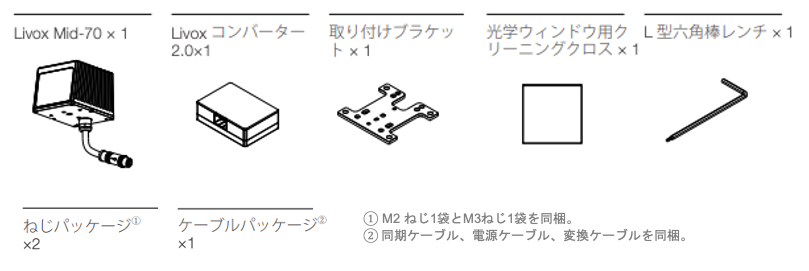 電源ケーブル、Livox 3線式航空コネクターなどの電源供給用ユニット、通信ケーブル※3線式コネクタは通信(LANケーブル)を含む