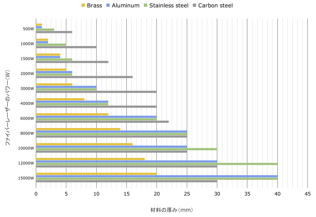 ファイバーレーザーのパワーと切断可能な材料の厚み