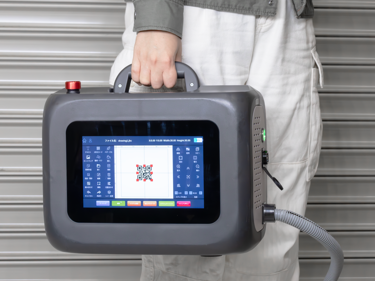 持ち運びながら印字・刻印できるハンディタイプの レーザーマーカー です。本体にバッテリーを搭載しコンセント不要で自由に持ち運びが可能です。タッチパネルの簡単操作で、場所を選ばず使用できます。ワイヤレスの刻印機やハンディ式打刻機と比べ高精細な印字が可能です。