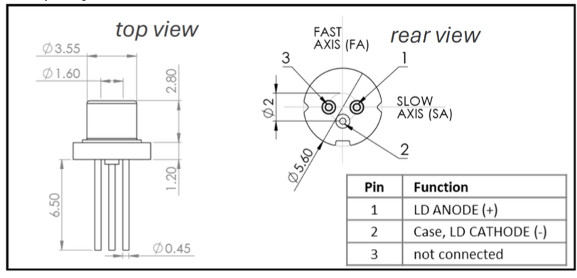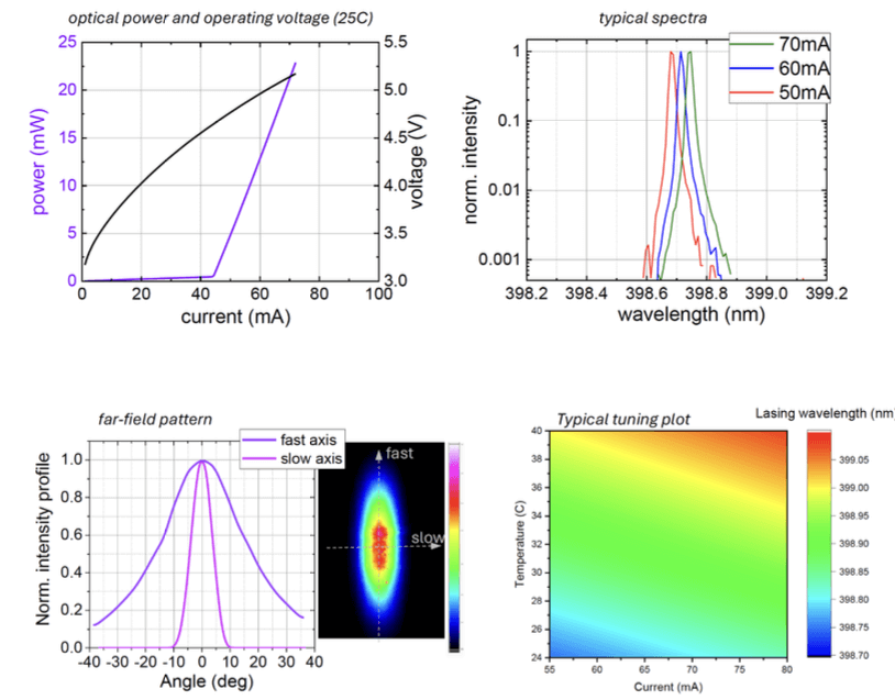 本製品は、中心波長399 nm帯で動作するDFB構造のレーザーダイオードです。DFB構造により単一縦モード発振を実現しており、温度制御や電流制御と組み合わせることで、高い波長安定性が求められる用途に対応します。パッケージにはTO-56を採用しており、コンパクトな光学系や既存システムへの組み込みが容易です。