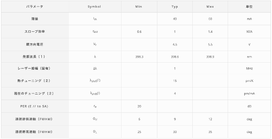 本製品は、中心波長399 nm帯で動作するDFB構造のレーザーダイオードです。DFB構造により単一縦モード発振を実現しており、温度制御や電流制御と組み合わせることで、高い波長安定性が求められる用途に対応します。パッケージにはTO-56を採用しており、コンパクトな光学系や既存システムへの組み込みが容易です。