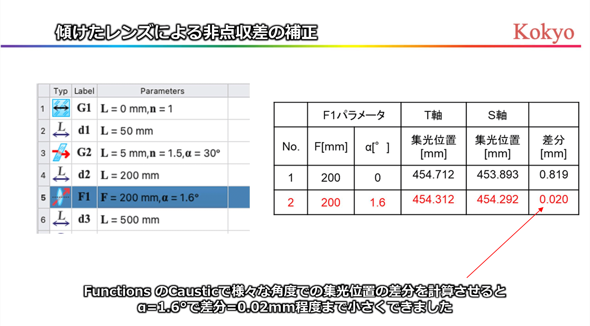 - レンズ設計:Multirange Caustic を用いた集光位置・ビーム径の可視化、傾斜レンズによる非点収差補正など