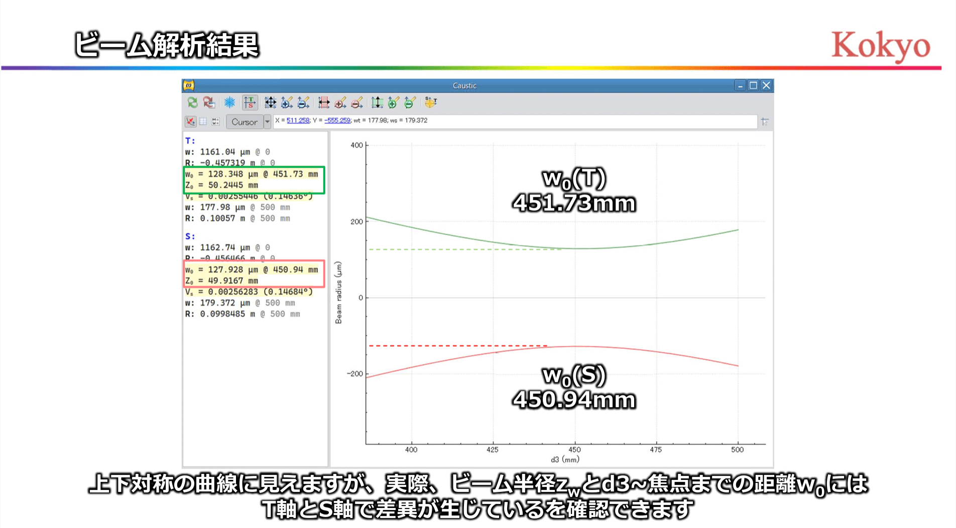 非点収差解析画面(例) — ビーム伝搬の可視化/非点収差の評価表示