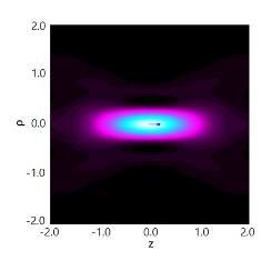 高NA(1.32)ラジアル偏光ビームの焦点位置および焦点通過時の縦波(Z波)成分の正規化強度です。強度0と1はそれぞれ黒と白に対応します。