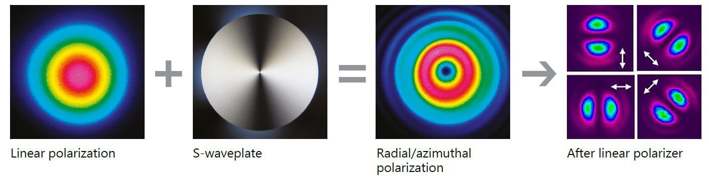 S波長板は、微細加工技術によって溶融シリカ内部に形成されたナノ格子構造により、ラジアル偏光やアジマス偏光などのベクトルビームを生成する光学素子です。これらのビームは高い集光特性を持ち、レーザー加工、光ピンセット、STED顕微鏡、二光子励起蛍光顕微鏡などの用途に利用されます。