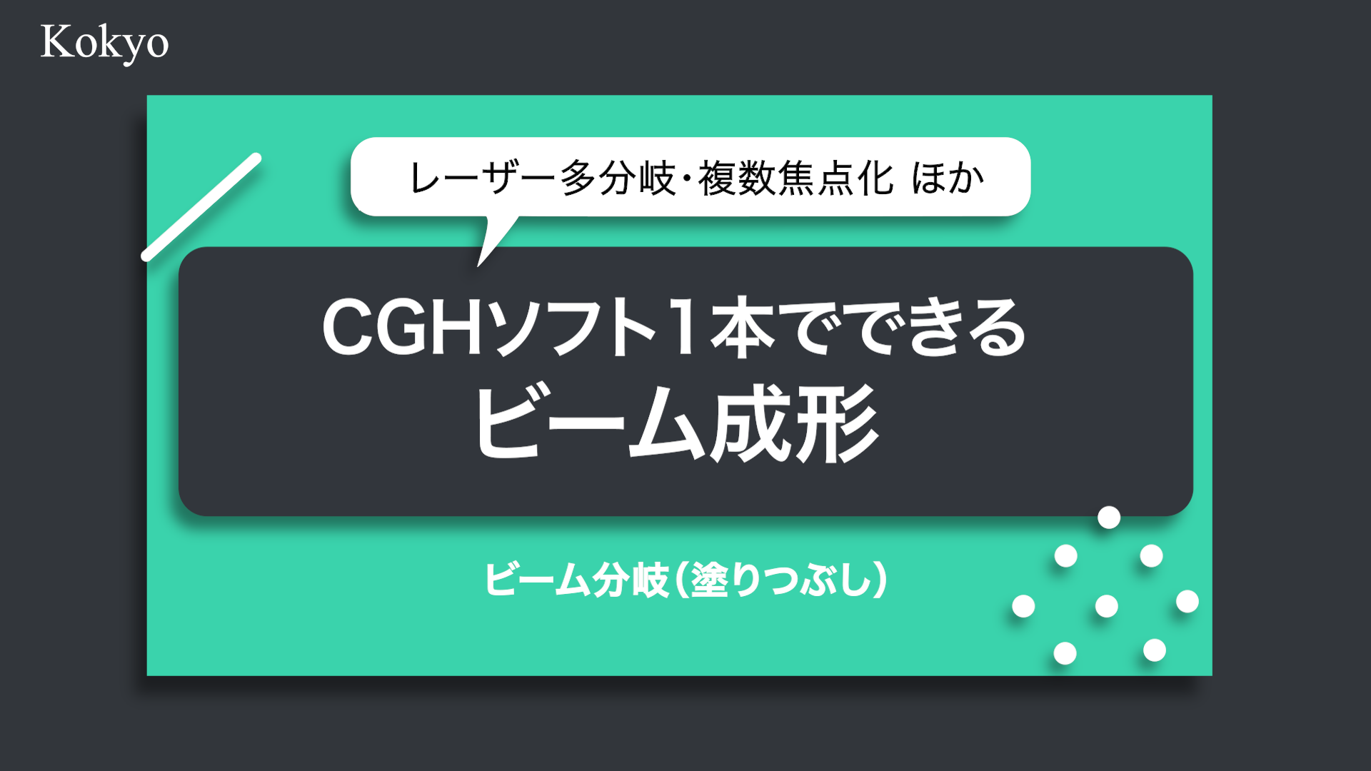 CGHソフト(Computer-Generated Hologram Software)は、空間光位相変調器(Liquid Crystal on Silicon Spatial Light Modulator:LCOS-SLM)を制御することができるソフトウェアです。収差補正、多点同時加工、レーザービーム成形といった機能を備えており、主に高価な回折光学素子(Diffractive Optical Element: DOE)を作製する前の動作確認用・試作開発用として利用されています。