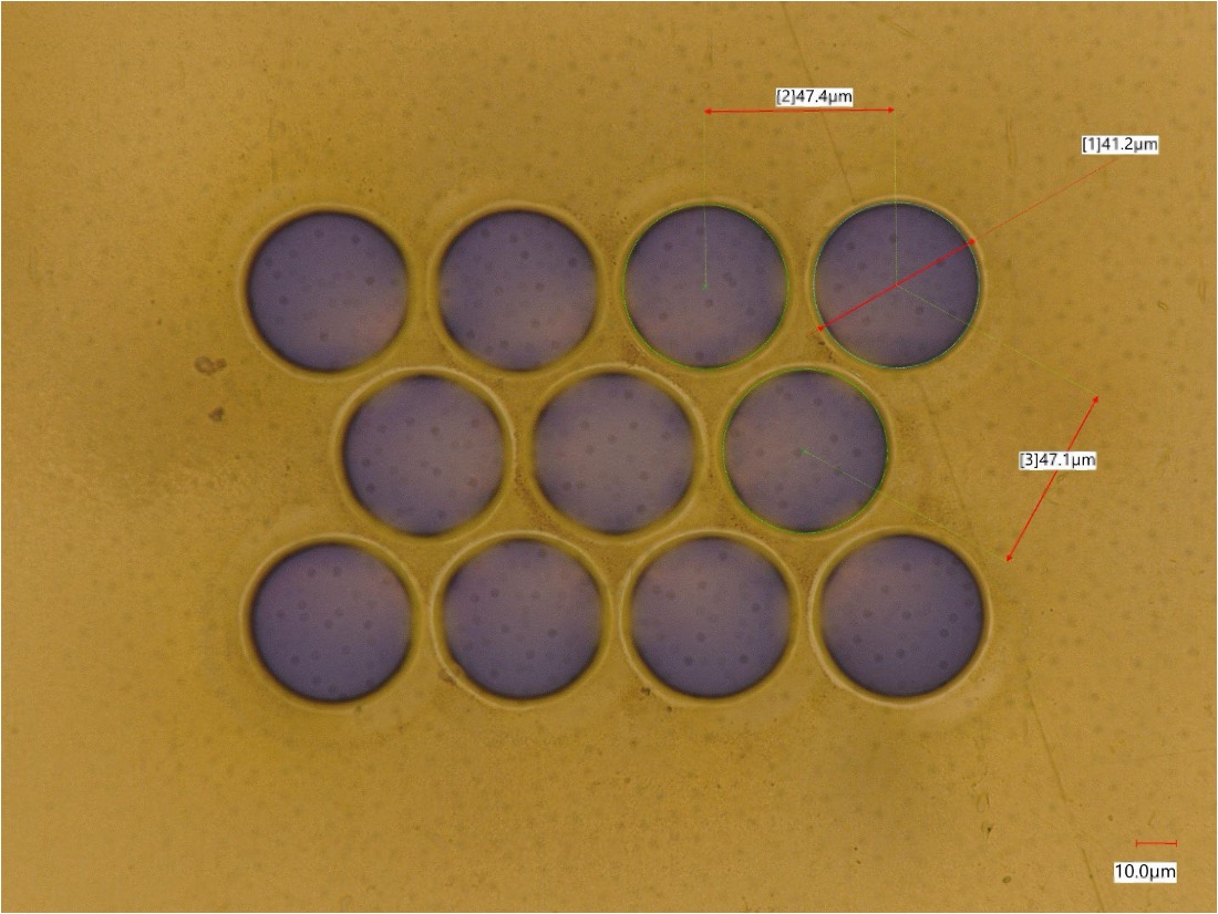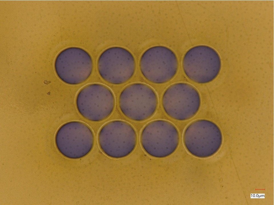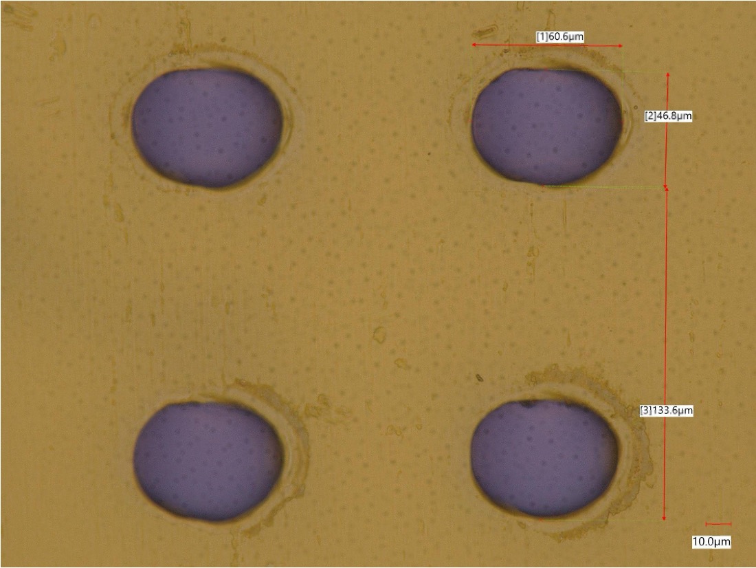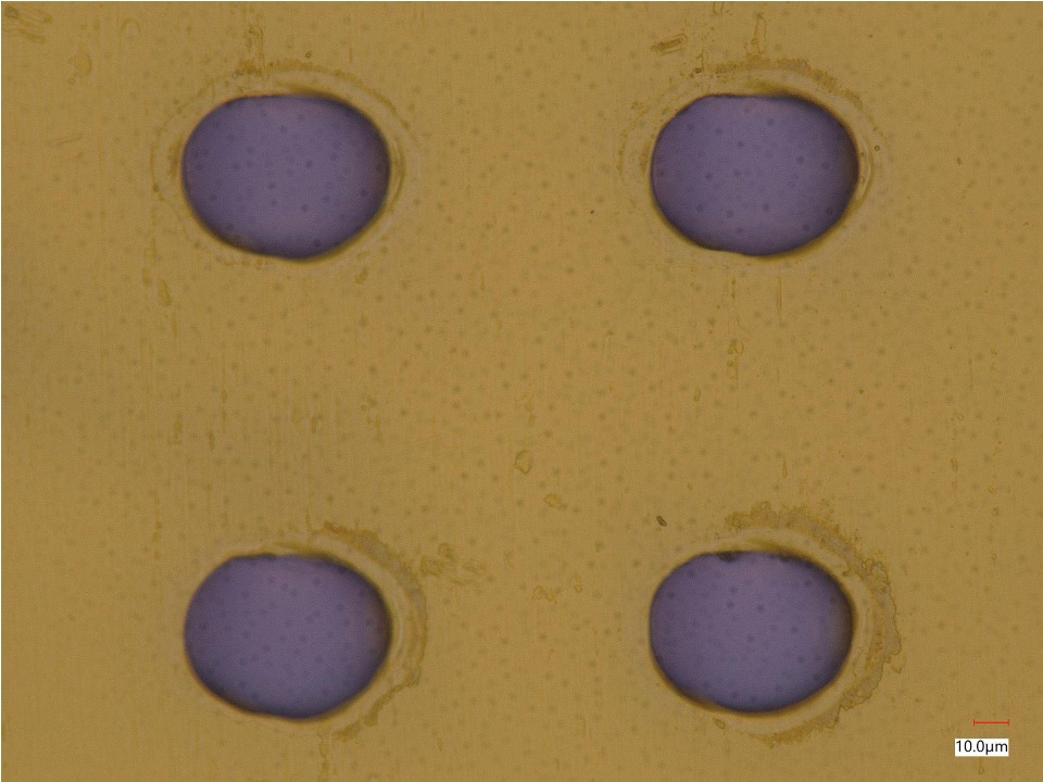 フェムト秒レーザーの方が、品質良く加工できている。ナノ秒レーザーの方が材料に対して熱影響が大きいため、穴形状が歪みやすい。フェムト秒レーザーは穴同士近づけても、壁をミクロン単位まで狭くできる。(画像は6 μmくらい)