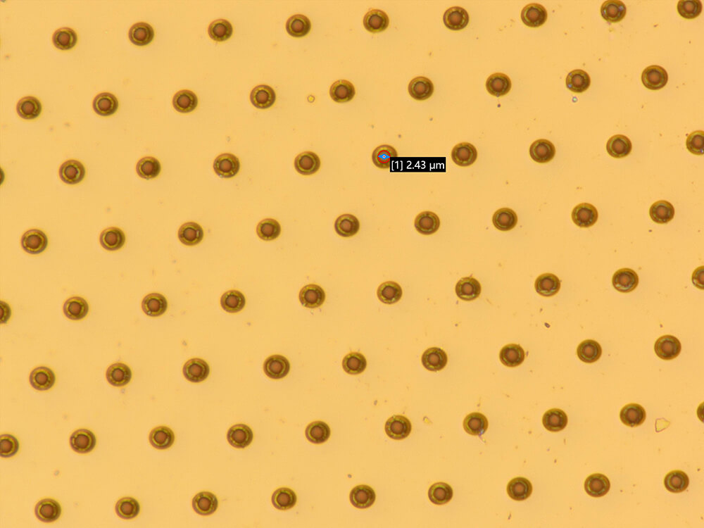 フェムト秒レーザーは穴同士近づけても、壁をミクロン単位まで狭くできる。(画像は6 μmくらい)